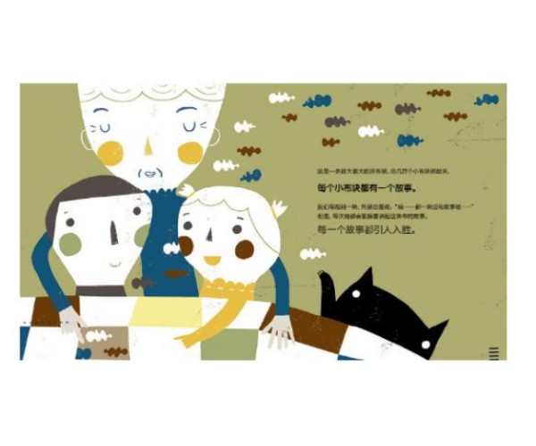 外婆的拼布被很大,不仅能带来温暖,还是外婆的故事书。因为这是由好几百个小布块拼起来的,每个小布块都有一个故事。这条拼布被上,连缀了一个家庭四代人生活中的点点滴滴,就像一本特别的家庭相册,收集着一家人的回忆……