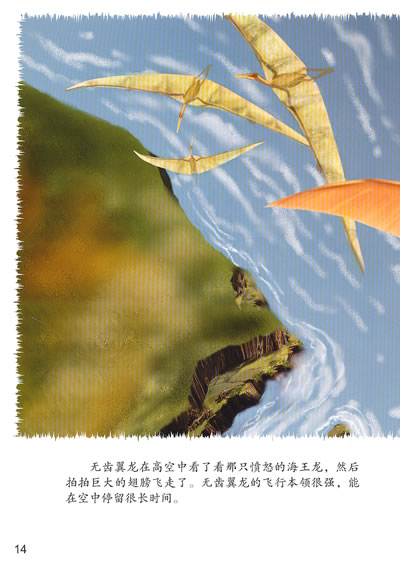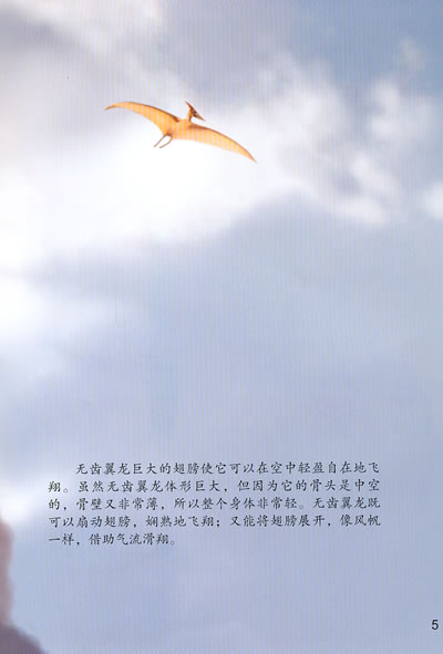 “无齿翼龙”在拉丁语里的意思是“有翅膀而没有牙齿”。无齿翼龙生活在距今8000万年~8900万年的白垩纪晚期,是当时最大的会飞的爬行动物之一。无齿翼龙卓越的飞行能力要归功于其轻盈的体态。它的骨头是中空的,里面充满了空气,外壁只有蛋壳那么薄。无齿翼龙的骨头很轻,这就大大降低了其整体体重。另外,无齿翼龙的尾巴很短,有助于它们在飞行过程中快速翻转及俯冲。