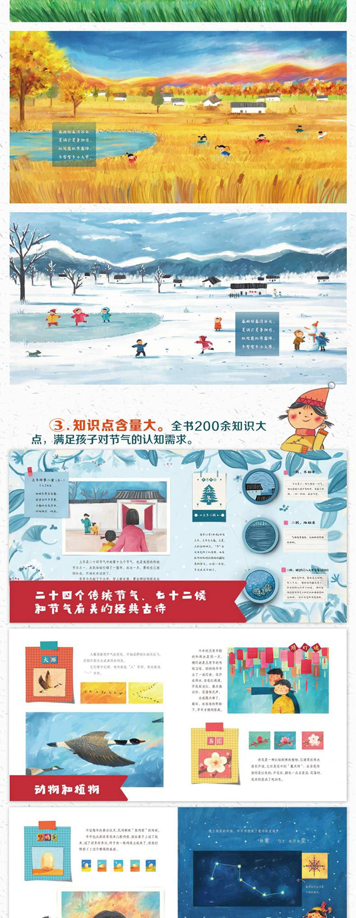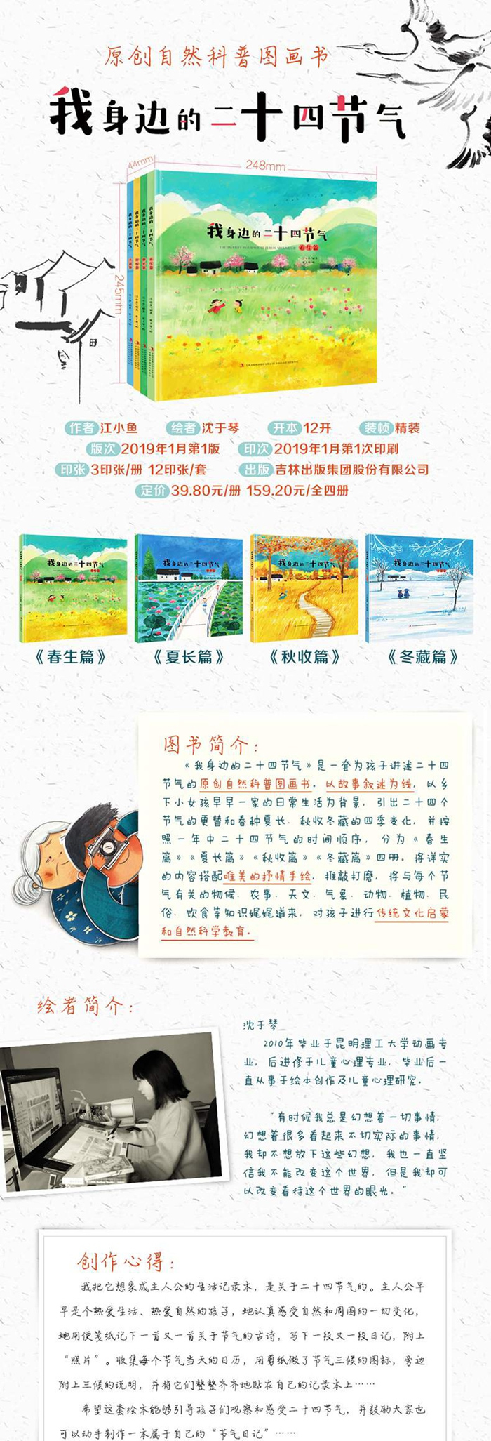 这是一本为孩子讲述二十四节气的原创自然科普图画书,包含立春、雨水、惊蛰、春分、清明、谷雨6个节气。本书按照二十四节气的时间顺序,将详尽的内容配以精美的手绘插图,将与每个节气有关的天文、气象、物候、农事、民俗等知识娓娓道来,对孩子进行了传统文化启蒙和自然科学教育。书的内容、形态、大小适合低龄儿童学习使用。本系列共有4册,系统地划分为8大版块:节气由来、古诗谚语、天文气候、 七十二候、动物植物、农事活动、民俗节日、观察互动。