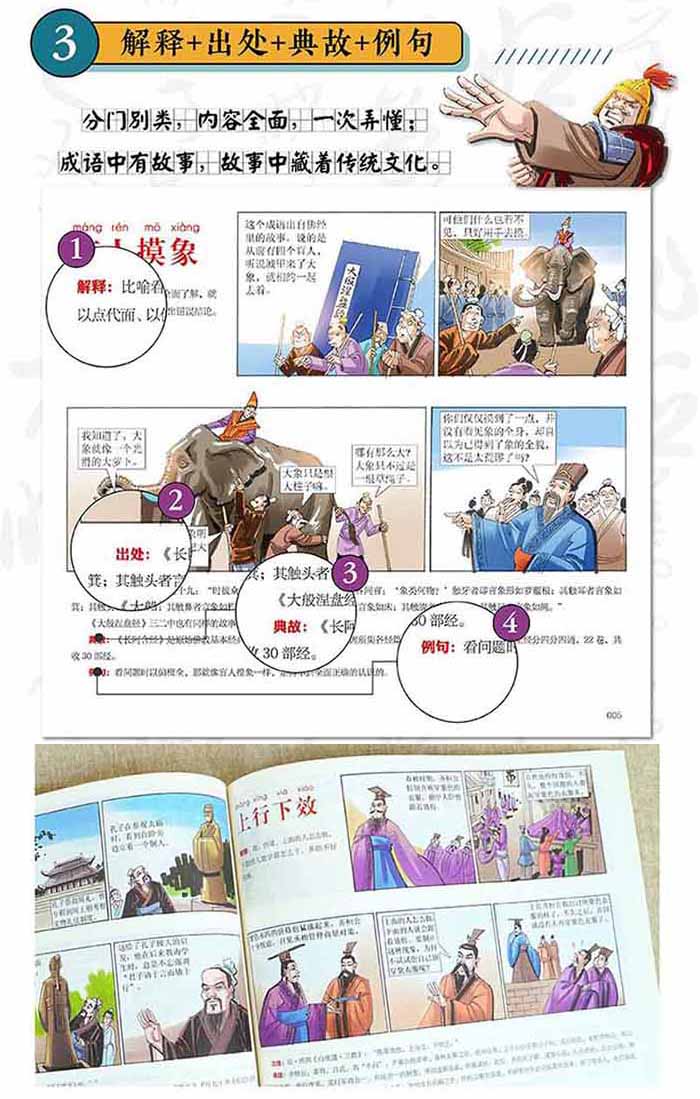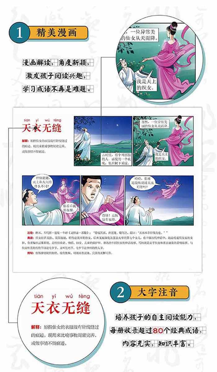 ◆《漫画成语故事》的人物形象鲜明生动,故事皆有所依据,服装场景道具都依照史实,没有现在漫画常犯的戏说胡说演绎的毛病。作者独运匠心,妙手生花,画风精致,文字优美,故事完整,情节丰富,人物栩栩如生,有很强的画面感,能带来较好的阅读感受。 ◆本套《漫画成语故事》力求寓教于乐,向孩子传输正确的文化和历史知识,是值得孩子阅读的精品漫画童书。