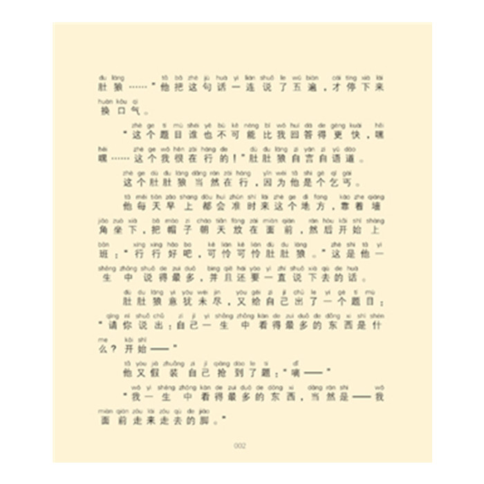 第二章 王碎先生 玉碎先生日记 4月22日我从来都相信自己的眼光,今天比任何时候都相信:肚肚狼绝对不是一般的狼,不过他需要我的帮助才行。 肚肚狼有点失神地望着地面。又有一双脚匆匆地走过来,在离他几步远的地方站住了。 肚肚狼抬起头来。站在面前的是仓鼠玉碎先生。他是肚肚狼的朋友,现在跟肚肚狼一起住在一间破屋子里。“我说,”玉碎先生双手叉着腰,很不满的样子,“你是不是忘记了?” “忘……忘记什么了?” 玉碎先生用手指着肚肚狼的额头。“今天晚上可是月圆之夜啊!” “对啊,又到了月圆之夜……现在几点了?”肚肚狼问。 玉碎先生把手抡了一个半圆,动作很夸张地看手上的表。“这个,最早是五点半,也可能是六点半或者七点……” 玉碎先生眨眨眼睛,好像在思考一个很难的问题。 “你这话什么意思?”“表上倒是指着五点半,但实际上不一定是五点半,” 玉碎先生有点不好意思,“因为这表经常会停,现在它也正停着……”“什么破表……”肚肚狼嘀咕了一句。“破表?我说,你懂不懂啊?”玉碎先生说,“这可是一只金表,到我手里已经传了第八代了。摇摇它,这手表还是会走的嘛……我说,我们家族传下来的东西,不会差!我们从前的家族,多么辉煌!我说,你看一下我背上的黑纹就知道了。”玉碎先生一边说,一边开始甩他的手臂,那样,手表可以继续走。 “希望它能传到第九代。”肚肚狼嘀咕着。玉碎先生出身在一个名门望族里,他有着非常高贵的血统,因为他背上有一道黑纹。一般的仓鼠只是尾巴比较短(鼠类尾巴越短出身就越高贵),背上没有黑纹,而他玉碎先生,不但尾巴比较短,最重要的是背上还有一道黑纹。这样的仓鼠,叫做花背仓鼠。所有的仓鼠们都知道,花背仓鼠是仓鼠中的贵族。不过仓鼠以外的动物可能不知道,所以玉碎先生经常要解释这个问题。玉碎先生的家族,从前多么辉煌,但是,后来却越来越没落,到了玉碎先生这一代,已经什么也没有了。让家族再度辉煌起来,一直是玉碎先生的梦想。就是为了实现这个梦想,像他这样高贵的仓鼠,才愿意委屈地和这个乞丐住在一起。为什么和肚肚狼住在一起,能让仓鼠的家族再度辉煌起来呢?那是因为在肚肚狼身上,有一种非常奇特、非常神秘的现象,他和天上的月亮有联系。玉碎先生已经知道这个秘密,只是他还没有掌握这个秘密。等他一旦掌握了这个秘密,并且把它公布出来,就一定会震惊全世界!就连肚肚狼也傻乎乎地弄不清楚,还以为自己就是一个乞丐,只有他玉碎先生才知道根本不是那么回事。这时候,趁着玉碎先生发呆想心事的时候,肚肚狼还在加班: “行行好吧,可怜可怜肚肚狼!行行好吧,可怜可怜肚肚狼……”玉碎先生看着肚肚狼,心里想:那个傻乎乎的肚肚狼,可不是一般的乞丐,他总有一天会成为世界名人,当然啦,这得靠我一手来安排才能做得到!等他成了世界名人,我们花背仓鼠家族又可以重新辉煌起来……所以,我就忍耐一点吧……玉碎先生完全想入神了。 忽然,他又惊醒过来。 “今天是月圆之夜,快,快,我们回去!”玉碎先生叫着,拉着肚肚狼往家里走。“可是,我还没有吃晚饭……”肚肚狼说。 “得了得了,嘴巴不要这么馋。” “可是,吃饭不是嘴巴馋吧……”肚肚狼想申辩。“行了行了,还有比吃饭更重要的事。” 玉碎先生不理他,拉着肚肚狼就往家里跑。 P6-10