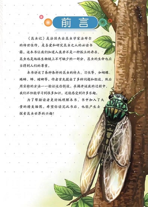 作者数十年间,不局限于传统的解剖和分类方法,从法国南部普罗旺斯种类繁多的昆虫中选取一些种类进行观察,如蜜蜂、蚂蚁、蟋蟀、蜘蛛、圣甲虫、金龟子、蝉等,生动详尽地记录下这些小生命的体貌特征、食性、喜好、生存技巧、蜕变、繁衍和死亡,然后将观察记录结合思考所得书写成多层次意味、全方位价值的鸿篇巨制,使昆虫世界成为人类获得知识、趣味、美感和思想的文学形态。书中最引人注目的还是流露在字里行间的人文关怀。书中,法布尔把昆虫当做活生生的生命来看待,用拟人化的手法将昆虫写得有声有色,有情感有性格,使文章自然亲切,妙趣横生。更值得一提的是,《昆虫记》还透过昆虫世界折射出关于人类的社会与人生的思考,无形中指引着读者在昆虫的“伦理”和“社会生活”中重新认识人类思想、道德与认知的准则。