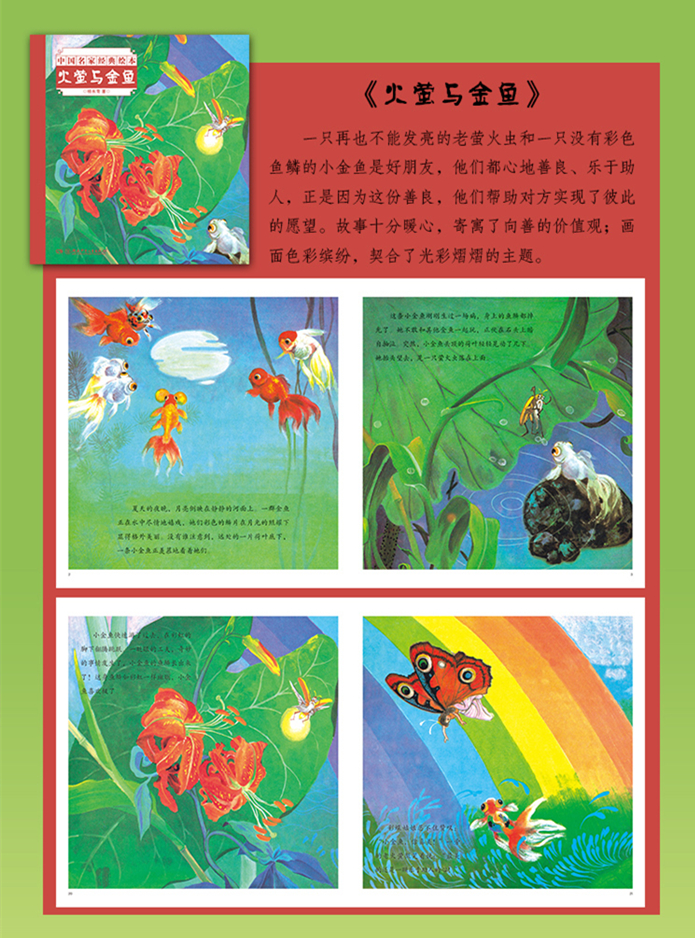 《火萤与金鱼》,故事十分暖心。一只再也不能发亮的老萤火虫和一只没有彩色鱼鳞的小金鱼是好朋友,他们都心地善良、乐于助人,正是因为这份善良,他们帮助对方实现了彼此的愿望——萤火虫的灯再次闪亮,小金鱼获得彩虹般绚丽的鱼鳞。