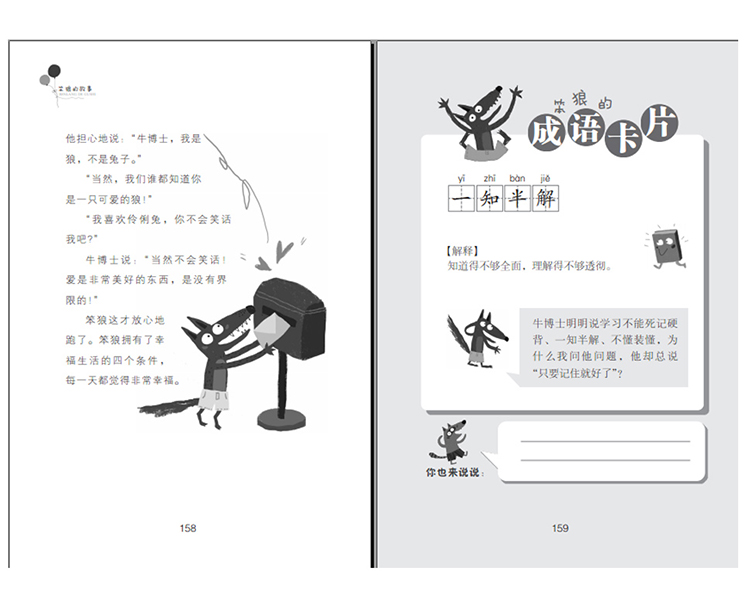 “聪明兔,你说说看,书上为什么要画这些好吃的东西呢?”笨狼问。
