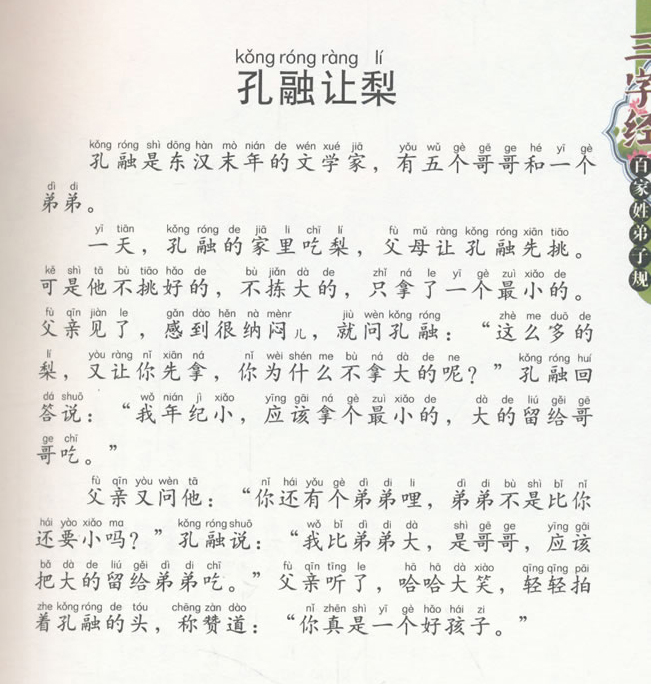 《三字经 百家姓 弟子规》将三部经典集合成册。以原文 译文 故事的形式呈现,全部标注拼音,即可亲子共读,又可自主阅读。译文部分使用通俗易懂的语言,符合儿童的阅读习惯,更易理解其中的含义。另外,还精心挑选了与之对应浅显易懂的小故事,有孔融让梨、孟母三迁、女娲补天等经典故事,还有孔子韦编三绝、周公制礼、牧野之战等历史知识,让小朋友在潜移默化中重温经典、学习知识、培养人格。