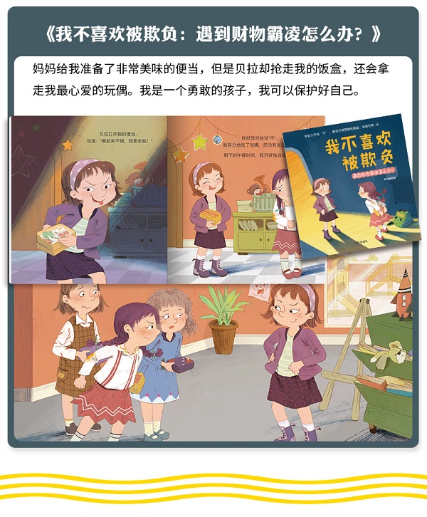 有关校园霸凌事件的新闻通过新媒体不断被报道并受到广泛关注,在孩子年纪较小时遭受这些欺凌甚至暴力之后,不仅会对他们的身体造成伤害,更会对其心理产生极大的负面影响。然而欺凌者和被欺凌者往往都是受害者,虽然二者具有明显的性格标签,但两种角色也会随着时间和情况发生转变,孩子在不所知的情况下完成“霸凌” 行为,但很可怕的是孩子并不知道这就是霸凌,也不知道该如何处理,如何求助。对此要时刻了解孩子的心理,以便及时调整孩子的行为,让孩子能正确地明断对错。通过大量的调研,结合孩子在生活中可能会遇到的各种隐性危害,以套书的形式(共8本)将自我保护的正确方式传递给孩子,让孩子能够从中学会辨别霸凌、远离霸凌的方法。安全有效地对霸凌说“不”!