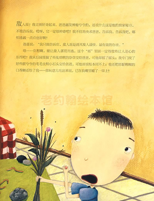 故事一开始,小主人公就立了一个敌人,并且在无时无刻地提醒自己,不能放松警惕,而他的爸爸在觉察到这一点之后,投其所好地说,要做一种叫做“敌人派”的东西,来帮助孩子打倒敌人,这太让人好奇了,会是什么呢?当我读到爸爸让他去和敌人好好地相处一天的时候,我似乎有点明白这位父亲的用意了,或许在听故事的孩子还没有领略到这一点,还一心想着如何去消失敌人,到了最后,当孩子怕所谓的“敌人”吃了派之后会出现什么状况大叫的时候,孩子也明白了,原来这个派,是这个用意啊!