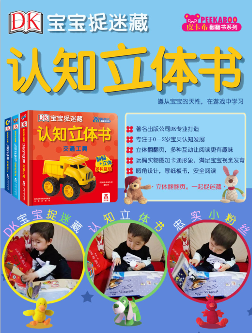 《DK宝宝捉迷藏认知立体书》分别介绍了交通工具、颜色和玩具,将真实的玩具照片,通过特殊有趣的纸艺,制作成一套有趣的立体翻翻书,让孩子在游戏中进行认知。在书中找找看小鸡、飞机、玩偶……通过捉迷藏的游戏方式,使用立体工艺,让孩子在游戏中进行认知,对阅读更有兴趣。