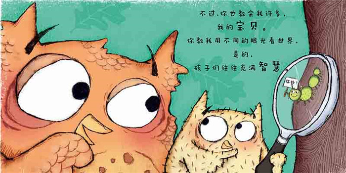 《宝贝,我爱你》展现了爸爸眼里孩子成长的点点滴滴。在猫头鹰爸爸的眼中,猫头宝宝从出生,到进食,再到学习飞翔,都倾注了爸爸全部的爱。这种爱,伴随孩子长大,是孩子永远的依靠。