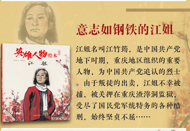《英雄人物绘本·江姐》意志如钢铁的共产党员江姐。江姐名叫江竹筠,是中国共产党地下时期,重庆地区组织的重要人物,为中国共产党追认的烈士。由于叛徒的出卖,江姐不幸被捕,被关押在重庆渣滓洞监狱,受尽了国民党军统特务的各种酷刑。特务妄想从这个年轻的女共产党员身上打开缺口,以破获重庆地下党组织。面对敌人的严刑拷打,江姐始终坚贞不屈,终于不幸被残忍杀害,为共产主义理想献出了年仅29岁的生命。本书讲述的是江姐的生平和可歌可泣的动人事迹。