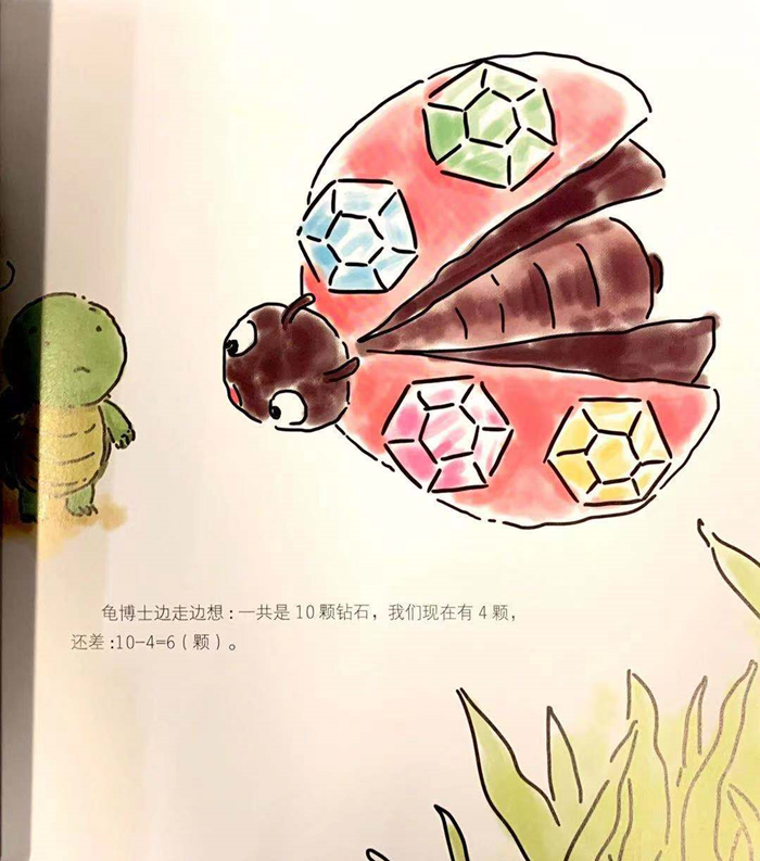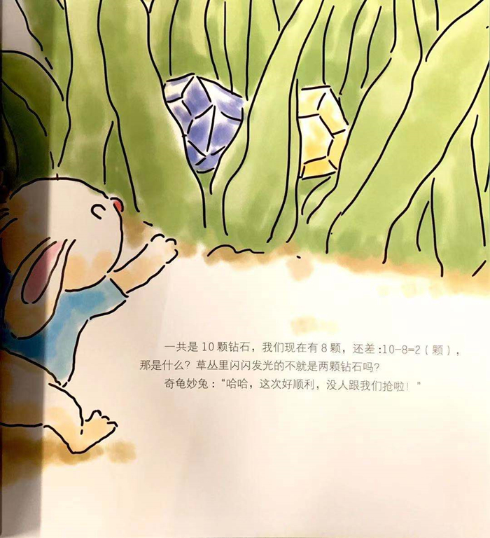 小朋友们,你们没有猜错,在这一集中,神奇龟和妙妙兔又从树屋中迷迷糊糊地穿越到了猪猪小镇。这次三只小猪遇到的麻烦是,猪小妹弄丢了奶奶的钻石,而奶奶的钻石实在太小了,小到掉到草丛中根本看不到。不过这种事情根本难不倒奇龟妙兔,这次他们带来了“缩小液”!缩小后的神奇龟和妙妙兔用各种好玩的东西同小昆虫们交换了他们捡到的钻石,小朋友们在读这个故事的时候,将能学会十以内减法的运算。