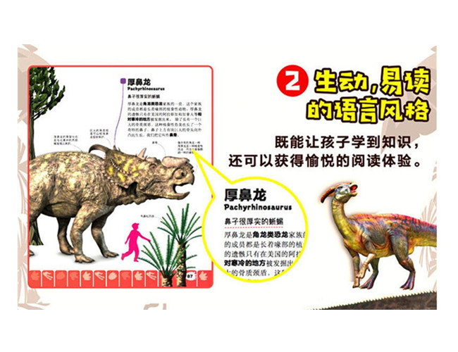 全书详细介绍了100种恐龙!在这里你可以找到每一只恐龙名字的含义。一般来说,通过名字你大概就能猜出它的某个特征,或者知道它最开始是在哪个地方被发现的。在这里你可以真正了解每一种恐龙,慢慢走进它的世界——获取更多恐龙的相关信息,它喜欢吃什么东西,以及它的哪些特征与众不同。在这本书里,你时不时会看到一个内容非常丰富的专题页面。通过阅读这些专题内容,你可以更加系统地了解史前世界和各种恐龙的相关知识!恐龙时代,第一批恐龙开始在地球上出现,那是在离我们很遥远的中生代时期,这一时期从大约2亿5000万年前一直持续到了6600万年前。中生代是显生宙的三个地质时代之一,可分为三叠纪、侏罗纪、白垩纪。那时,地球比现在更加暖和,所有的大陆连在一起,形成了一个超级大陆,也叫作盘古大陆。建议CIP分类为科普。