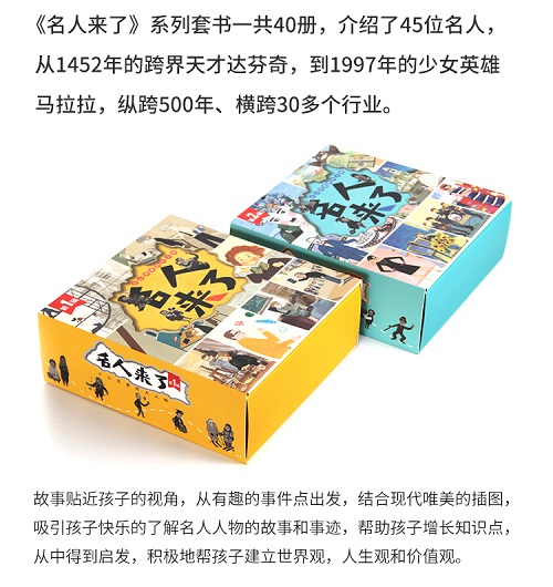 《名人来了》第二辑系列套书共20本,每一本介绍一位人物,主要涉及设计师,演艺者,摄影,艺术家等名人。故事贴近孩子的视角,从有趣的事件点出发,结合现代唯美的插图,吸引孩子快乐地了解名人人物的故事和事迹,帮助孩子增长知识点,从中得到启发,积极地帮孩子建立世界观,人生观和价值观。