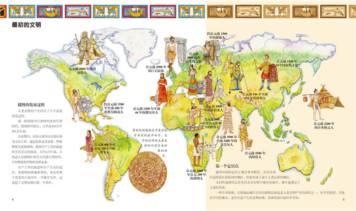 1、手绘插图,精美细致。图文并茂地还原出各种历史场景,便于孩子理解、感受不同历史发展时期的世界文明。