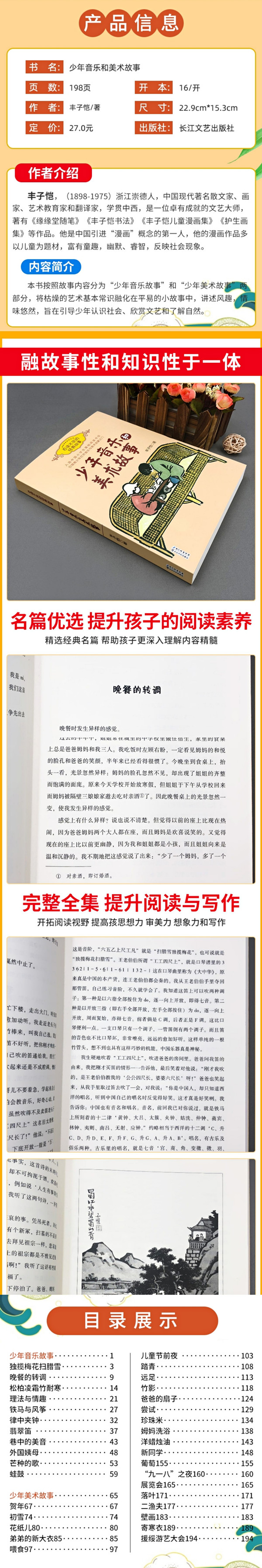 丰子恺少年时期学习音乐和美术的经历和趣味盎然的小故事,按照故事内容分为“少年音乐故事”和“少年美术故事”两部分,将枯燥的艺术基本常识融化在平易的小故事中,讲述风趣,情味悠然。作者旨在通过这些小故事,讲述自己对音乐与美术的理解,从而启发青少年对音乐和美术的兴趣。