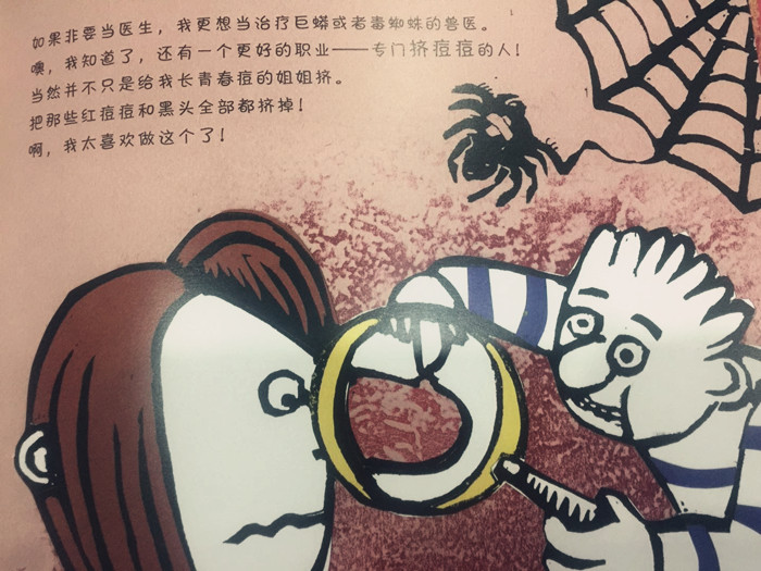 对于将来要从事什么职业,孩子们总有很多想象。故事的叙述者“我”对于自己将来要做什么的设想,充满了浪漫主义色彩,比如::雕塑云朵的人,摘星星的人,在足球场上专门画白线的人,帮圣诞老人清理烟囱的人,玩水枪的人,糖果试吃员,治疗巨蟒或者毒蜘蛛的兽医……这是属于孩子的美好职业想象。