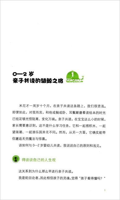 怎样让孩子从小爱上阅读行为,这是很多父母的难题。本书作者通过自己在共读过程中跟孩子斗智斗勇但不失温馨的经历,告诉所有父母:亲子共读的第一个成果,是失败。但只要父母像辛勤的老农沉默而无所求地翻动土壤那样翻动绘本,孩子一定会从灵魂里开出热烈的花来呼应你。共读,归根到底不在“读”,书只是通往心灵的“途径”。骑鲸之旅最重要的,是彼此怀着温柔的心共同寻找和经历。只要让孩子感觉到共读过程中的爱与被爱,让真与美降临在他们心田,让幻想王国在他们灵魂里扎根,那么哪怕仅仅读了一本书,这趟骑鲸之旅都是奇妙殊胜的。