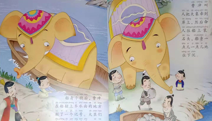《曹冲称象》取材自中国民间故事,讲述了三国时期,曹操的儿子曹冲,在一次宴会上,巧妙地运用石头的浮力等于大象浮力的原理,计算出了大象的重量,令众人拍手称赞。