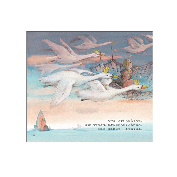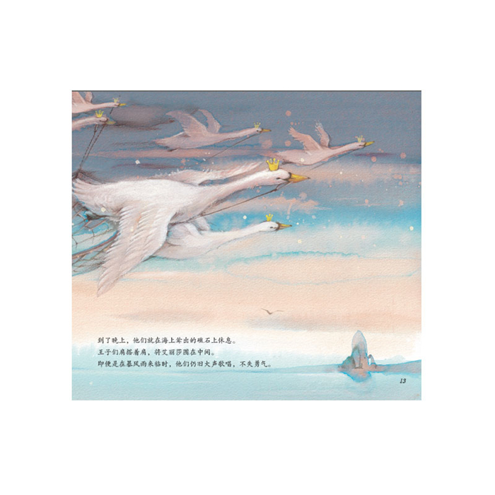变成了天鹅的王子们,离开了皇宫,朝着天边飞去。