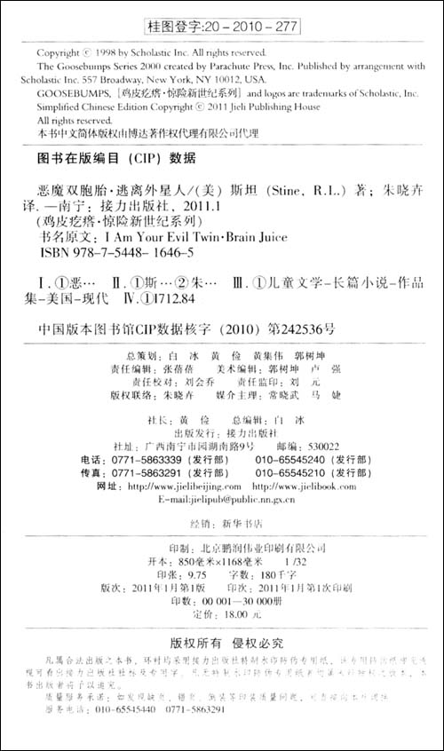 《恶魔双胞胎·逃离外星人》是“鸡皮疙瘩”经典书系的全新延伸,作品延续了R.L.斯坦天马行空的想象和引人入胜的故事构架,更融入许多神秘莫测的高科技和新奇好玩的奇幻元素。作者以高远神奇的想象和轻盈谐趣的笔致,为我们创造了一个寓格斗于心巧、化惊恐为神妙、融怪诞于幽默的文学世界。阅读这套丛书宛如一场惊心动魄的冒险历程,酣畅淋漓的描写,紧张诡秘的场面,机敏诙谐的人物,让你屏息,让你发笑,也让你思考。