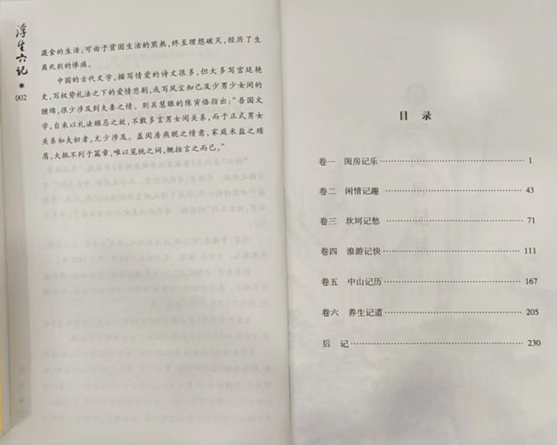 《浮生六记》为自传散文体小说,书中记闺房之乐,琴瑟相和、缱绻情深;记闲情雅趣,贫士心性、喜恶爱憎;记人生坎坷,困顿离合、人情世态;记各地浪游,山水名胜、奇闻趣观。作者以纯朴的文笔,记叙大半生的经历,欢愉与愁苦两相对照,真切动人。书中描述了他和妻子陈芸志趣投合,伉俪情深,愿意过一种布衣蔬食的生活,可由于贫困生活的煎熬,终至理想破灭,经历了生离死别的惨痛。 本书是一部流传极广影响极大的自传体随笔,在清代笔记体文学中占有相当重要的位置。作者以简洁生动的文笔描述了生活的方方面面,包括他的婚姻爱情生活、家庭变故、闲情逸趣、山水游记等,宇里行间流露出作者独特的人生态度、价值观念、性格气质和美学品位。