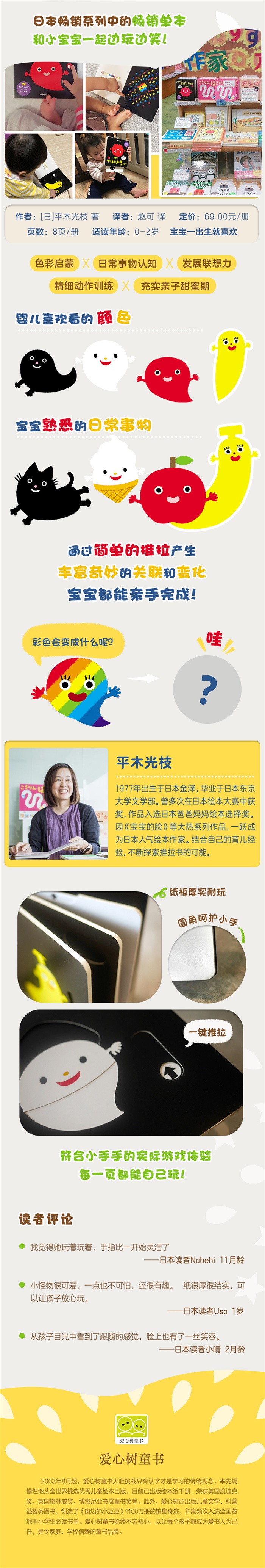 红色小幽灵变苹果、黄色小幽灵变香蕉、白色小幽灵变冰激凌……彩色小幽灵变什么?哇!!选用对宝宝具有吸引力的黑、白、红、黄色,与宝宝熟悉的日常事物相关联,奇妙惊喜的变化都通过简单的推拉来实现。小宝宝也能玩,享受机械运动和视觉感官的双重快乐!彩色小幽灵变出的烟花明暗交错,绚丽逼真,创造视觉小高潮!让宝宝玩到入迷!