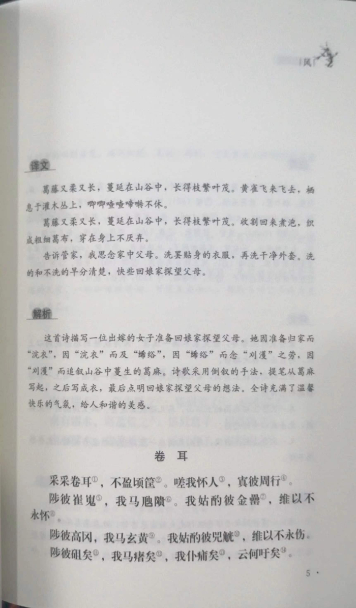 风 《风》,又叫《国风》,是《诗经》三大部分的部分。《诗大序》以为是用于教化、讽谏,以求改善政治风气的作品。国,即诸候统治的国家,《风》乃是采自各诸侯国的民间歌谣,与《雅》《颂》的主要区别在于音乐曲调上。包括周南、召(shào)南、邶、鄘、卫、王、郑、齐、魏、唐、秦、陈、桧(ɡuì)、曹、豳等地区和国家的诗,合称“十五国风”,共160篇。大部分为周平王东迁以后至春秋中叶的作品,对当时的社会政治生活做了比较广阔的反映。周南 《周南》是十五国风之一,系周公统治下的南方地区的民歌。西周初期,周公旦与召公奭分陕(今河南陕县)而治。周公居东都洛邑,统治东方诸侯,其地域包括洛阳以南,直到江汉一带。 关雎 关关雎鸠①,在河之洲②。窈窕淑女③,君子好逑④。 参差荇菜⑤,左右流之⑥。窈窕淑女,寤寐求之⑦。 求之不得,寤寐思服⑧。悠哉悠哉⑨,辗转反侧⑩。 参差荇菜,左右采之。窈窕淑女,琴瑟友之。 参差荇菜,左右芼之。窈窕淑女,钟鼓乐之。 ①关关:两鸟相互应和的鸣叫声。雎(jū)鸠:一种水鸟,即鱼鹰。据说雌雄有相对固定的配偶,情感专一,有“贞鸟”之美称。②洲:水中的小岛、陆地。③窈窕(yǎotiǎo):形容女子性格文静而美好的样子。④君子:指有品行、有修养的男子。好逑(qiú):好的配偶。⑤参差(cēncī):形容长短不齐的样子。荇(xìng)菜:水生植物,即水草,浮于水面,可供食用。⑥流:采摘。⑦寤(wù):醒着。寐(mèi):睡着。寤寐引申为日夜。⑧思服:思念。⑨悠:相思。⑩辗转反侧:左思右想,无法入眠。友:亲近。芼(mào):挑选,采摘。乐(lè)之:使她快乐。 关关鸣叫的鱼鹰,栖居在河中的小洲岛。文静美丽的姑娘啊,是君子理想的配偶。 长短不齐的荇菜,姑娘忽左忽右去采摘。文静美丽的姑娘啊,让我朝朝暮暮都思念。 追求她未能如愿,醒来做梦都思如潮。相思绵绵无绝期,翻来覆去难以入眠。 长短不齐的荇菜,姑娘忽左忽右去采摘。文静美丽的姑娘啊,我弹琴鼓瑟和她亲近。 长短不齐的荇菜,姑娘忽左忽右去挑选。文静美丽的姑娘啊,我敲钟击鼓换她笑颜。 这是一首爱情诗。一位纯情少年爱上了在河边采荇菜的漂亮女孩。河洲上相和而鸣的水鸟诱动了少年的痴情,水流中漂动的荇菜就好比姑娘那颗不易捕捉的心,使男子沉浸在无限相思之中。诗歌以雎鸟之鸣起兴,引出“君子好逑”之意,情随意动,意由情生。由爱慕到思念,思念又化为幻觉,将诗的意境步步提升。 葛覃 葛之覃兮①,施于中谷②,维叶萋萋③。黄鸟于飞④,集于灌木,其鸣喈喈⑤。 葛之覃兮,施于中谷,维叶莫莫⑥。是刈是濩⑦,为为绤⑧,服之无⑨。 言告师氏⑩,言告言归。薄污我私,薄浣我衣。害浣害否,归宁父母。 ①葛:多年生草本植物,茎的纤维可以织成布,称为葛布。它的块根含淀粉,可食用,亦可入药。覃(tán):延长的意思。②施(yì):蔓延。中谷:山谷中。③维:发语词。萋萋:茂盛的样子。④黄鸟:即黄鹂鸟。于:语气助词,无义。⑤喈喈(jiējiē):鸟的叫声。⑥莫莫:茂盛之态,与“萋萋”的意思相近。⑦刈(yì):割。濩(huò):煮。⑧(chī):细葛纤维所织的布。绤(xì):粗葛纤维所织的布。⑨(yì):讨厌。⑩言:语气助词,无义。师氏:旧时的管家奴隶,或是保姆。薄:发语词。污:洗去污垢。私:内衣。浣(huàn):洗。害(hé):通“曷”,何,疑问词。归宁:女子出嫁后回娘家探望父母,向父母问安。 葛藤又柔又长,蔓延在山谷中,长得枝繁叶茂。黄雀飞来飞去,栖息于灌木丛上,唧唧喳喳啼啭不休。 葛藤又柔又长,蔓延在山谷中,长得枝繁叶茂。收割回来煮泡,织成粗细葛布,穿在身上不厌弃。 告诉管家,我思念家中父母。洗罢贴身的衣服,再洗干净外套。洗的和不洗的早分清楚,快些回娘家探望父母。 这首诗描写一位出嫁的女子准备回娘家探望父母。她因准备归家而“浣衣”,因“浣衣”而及“绤”,因“绤”而念“刈濩”之劳,因“刈濩”而追叙山谷中蔓生的葛麻。诗歌采用倒叙的手法,提笔从葛麻写起,之后写成衣,后点明回娘家探望父母的想法。全诗充满了温馨快乐的气氛,给人和谐的美感。 卷耳 采采卷耳①,不盈顷筐②。嗟我怀人③,寘彼周行④。 陟彼崔嵬⑤,我马虺⑥。我姑酌彼金罍⑦,维以不永怀⑧。 陟彼高冈,我马玄黄⑨。我姑酌彼兕觥⑩,维以不永伤。 陟彼砠矣,我马瘏矣,我仆痡矣,云何吁矣。 ①采采:采了又采。卷耳:即苍耳,草本植物名,苗嫩可食。②盈:满。顷筐:斜口筐,前高后低。③嗟(jiē):叹词。怀:怀念。④寘(zhì):放下,搁。周行(háng):大道。⑤陟(zhì):登。崔嵬(wéi):高而不平的土山、高山。⑥虺(huītuí):疲劳,腿脚软。⑦罍(léi):酒器。⑧维:句首助词。永怀:长久地怀念。⑨玄黄:疾病的样子,也说眼花。⑩兕觥(sìgōng):用犀牛角制作的酒器。砠(jū):有土的石头山冈。瘏(tú):生病。痡(pū):过度疲劳而生病的样子。云:发语词。吁(xū):忧愁,忧叹。 采呀采呀采卷耳,好久采不满一浅筐。因为我特别想念我的心上人,将筐丢弃在大路旁。 登上那高高的土石山,马儿脚乏神颓丧。斟满一壶酒,喝上一杯慰藉我的思与伤。 再一次登上那高高的土石山,马儿腿软且迷茫。斟上满满的一大杯酒,免去我心中的悲伤。 又一次登上乱石山冈,马儿累倒在一旁,仆人精疲力又竭,无奈愁思不断。 这是一首抒写女子怀念远行丈夫的情感名作。她在采卷耳的时候不禁神思遐想,想起远行的丈夫。她想象着