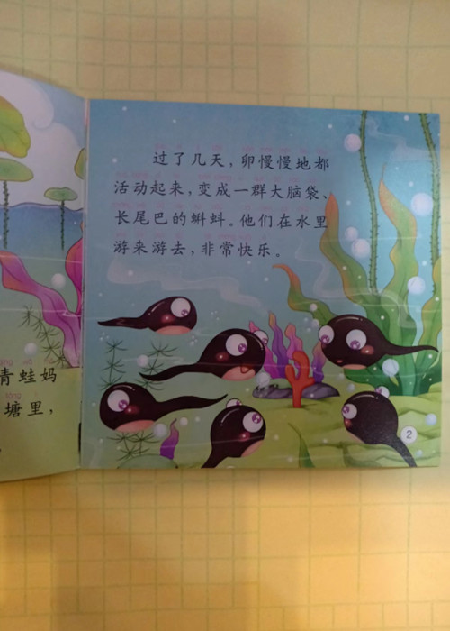 小池塘,长水草。草丛里,青蛙妈妈生了小宝宝。小宝宝,长大了,大脑袋,尖尾巴,变成了小蝌蚪,你追我赶快游呀!……