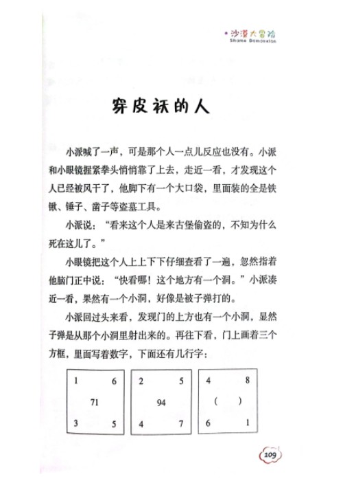 《彩图版李毓佩数学故事》是科普作家李毓佩影响最大的作品,分为斗智故事、侦探故事、冒险故事三大类。《沙漠大冒险》是冒险故事中的一册,故事主要讲述:小派和小眼睛这对好朋友在不同的际遇下三次来到沙漠,寻找外星人留下的数学题,古堡智斗坏老头,还在一座千年沙漠空城中几次被困,然而这样的际遇一次比一次好玩,一次比一次惊险。