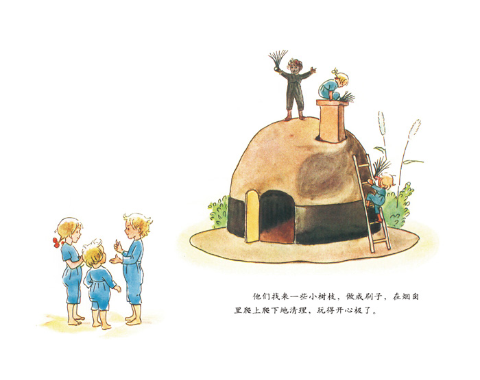 有三个好孩子,他们替妈妈清理烟囱,生火烧水洗衣服:也有三个坏孩子,他们把衣服弄得脏脏的,接着又把自家的小屋烧了精光——其实是同样的三个孩子!幸好在湖里划船的小矮人赶过来帮忙,才没有酿成大祸。