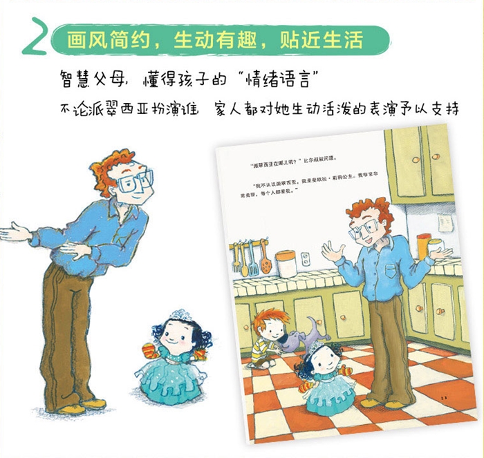派翠西亚喜欢玩装扮游戏!她的创造力几句感染力,让人感觉心情愉悦。这一刻她穿着美丽的公主裙变成了人人喜爱的莉莉公主;下一刻她又头戴女巫帽全身穿黑披风;接着她身穿妈妈的衣服变成了温柔慈祥的“帕特里夏妈妈"......她最后扮演的角色到底是谁那?当派翠西亚坚持说:“是我!”的时候,她的家人终于认出来,这就是他们的派翠西亚啊!
