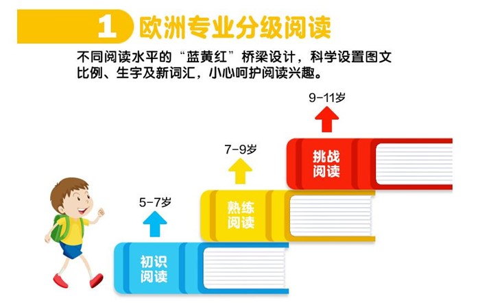 《我爱阅读》红、黄、蓝系列充分照顾到不同年龄段孩子的阅读落差,为孩子提供了一座斜坡式的进阶桥梁,打造了一个快乐阅读的无障碍空间。