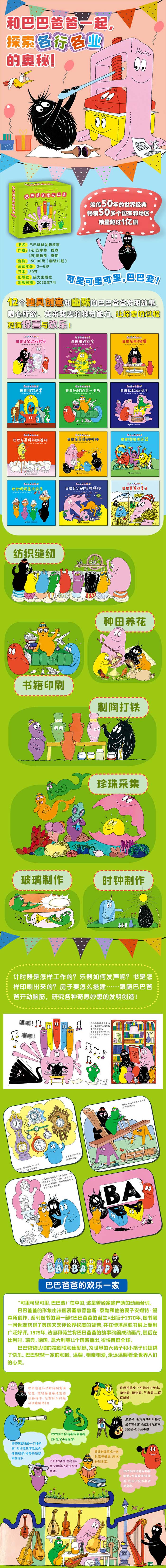 “可里可里可里,巴巴变!”在中国,这是家喻户晓的动画台词。巴巴爸爸形象由法国漫画家德鲁斯·泰勒和他的妻子安娜特·缇森所创作,“巴巴爸爸经典系列”的首本《巴巴爸爸的诞生》出版于1970年,书一出版就受到了英国评论界权威的赞誉,并在同年的博洛尼亚书展上受到广泛好评。此后,巴巴爸爸很快风靡整个欧洲。1975年,联邦德国将巴巴爸爸的故事改编成动画片,并于1981年在美国首播。很快,50多个国家的观众就从电视机里结识了巴巴爸爸一家。截止目前巴巴爸爸系列图书已翻译成30多种语言,全球销量超过一亿册。巴巴爸爸以他的独创性和幽默感,为世界的大孩子和小孩子提供了快乐。“巴巴爸爸”动画片在上个世纪80年代由中央电视台少儿频道播出,“巴巴爸爸”经典系列中文简体字版2010年由接力出版社出版以来,陪伴了众多中国小读者的成长,在中国几代人的心中种下了爱的种子,作品不但给千千万万中国孩子带来了欢乐,而且成为千千万万中国孩子的永恒记忆。温馨有爱和风趣幽默的巴巴爸爸家庭故事,天真又充满童趣的想象力。巴巴爸爸一家的和睦、温馨、相亲相爱,永远温暖着全世界人们的心灵。“巴巴爸爸发明故事系列”含17个巴巴爸爸的经典故事,内容