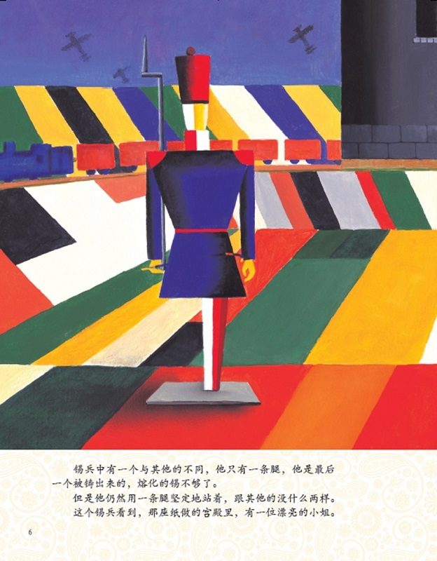 本书包括五部分内容。1. 名著故事:本书以绘本的形式讲述了《坚定的锡兵》的名著故事,以至上主义代表画家马列维奇的绘画风格为蓝本,完成了《坚定的锡兵》所有的插画。2. 画家简介:本绘本故事之后对马列维奇的生平及风格做了简单介绍。3. 作家介绍:本书对名著故事的作者生平及故事背景做了简单介绍。4. 画家代表作:本书展示一幅马列维奇的原作品,详细分析画家的绘画风格。5. 读后思考:本书既有故事的启迪和感悟,又有对故事情节和绘画风格的感受与思考练习。