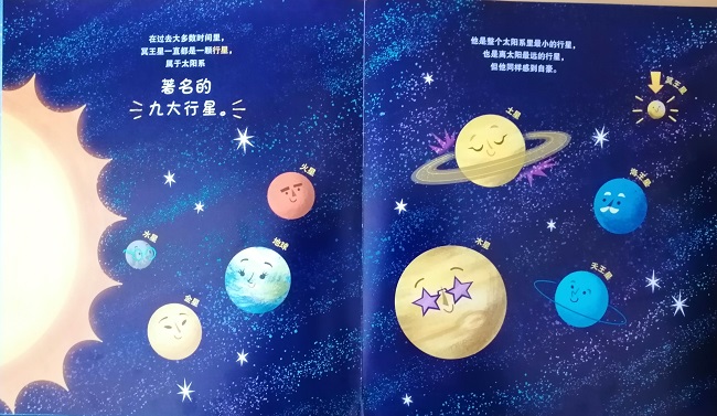 在2005年被发现的阋神星质量比冥王星多出27%,因此,国际天文联合会在2006年正式定义了行星的概念,新的概念里冥王星不再属于行星,也就不再有“九大行星”之说。本书以此为背景知识,讲述了冥王星被排除在行星大家庭之外后,寻找属于自己的家和朋友的故事。在冥王星寻找新家的冒险中,分别遇到了彗星、流星体、矮行星等,最后冥王星加入了与自己最为相似且唯一没有排斥自己的矮行星队伍。在书中,我们可以看到逼真的地球,环绕着漂亮行星环的土星,老爷爷形象的海王星,还有各星球之间孩子般的对话,丰富的表情等。