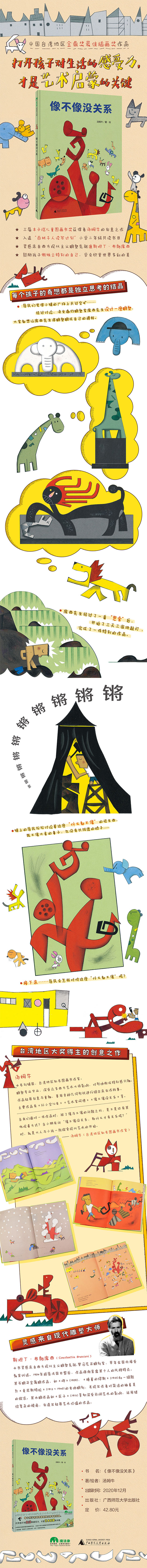 《像不像没关系》是广西师大出版社魔法象图画书王国推出的作品之一。 动物们觉得小镇的广场上太过空旷,经过讨论,决定邀约雕塑家库西先生在广场上设计一座雕塑,库西先生并没有急于设计,而是先到河边玩水,草原上发呆......*后拖着材料在广场上“锵、锵、锵”的连续工作了三天三夜,完成了一件“什么都不像”的雕塑。小镇上的动物们纷纷讨论,但过了很久,一只大黑鸟飞来,发现这座雕塑有些地方像大象的鼻子、狮子的鬃毛,还有像猴子在跳舞。这座雕塑像什么呢? 这是一本鼓励孩子去观察事物、感知生活,并将自己所看所想记录下来的图画书。灵感来自西方现代主义雕塑先驱康斯坦丁·布朗库西(ConstantinBrancusi)以及动态雕塑家亚历山大·考尔德(AlexanderCalder)。