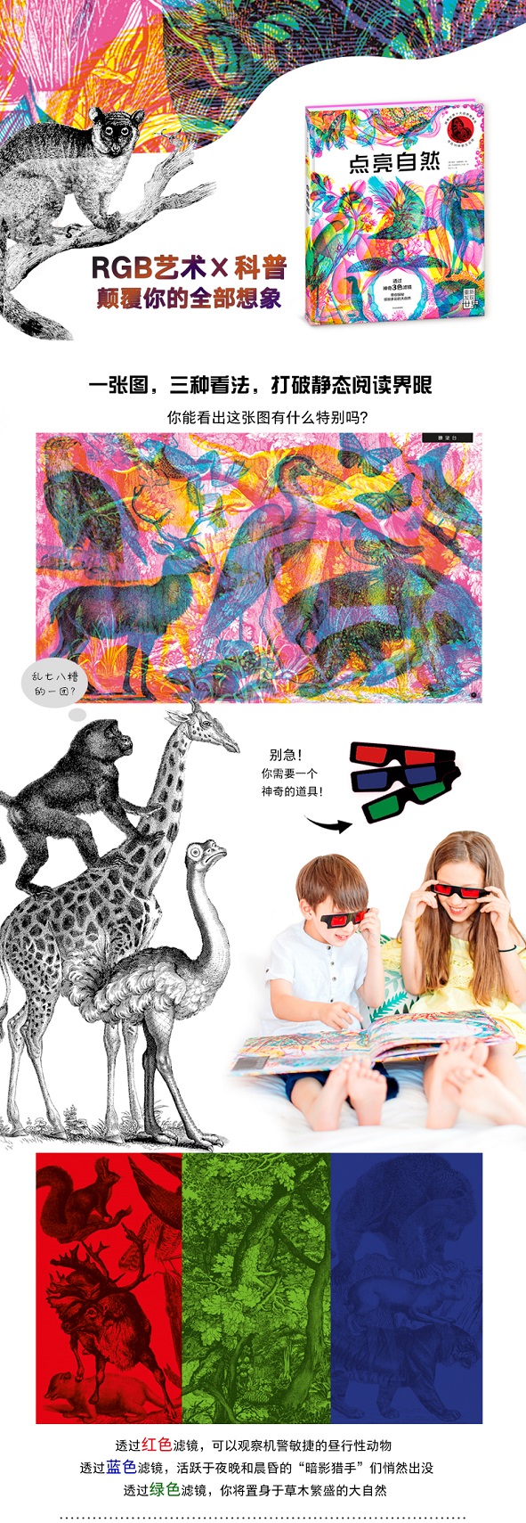 爱孩子,就带他看世界 一本书,足不出户,畅游世界十大自然生态地 ★ 一张图,三种看法,颠覆你对图书的全部想象 裸眼看时,是令人炫目的大幅彩色图画,戴上三色眼镜,灵动如生的野生动物和草木繁盛的栖息地会魔术般呈现在你面前。用红色滤镜观察昼行性动物;戴上蓝色滤镜搜索夜行和晨昏性动物;戴上绿色滤镜让你置身草木繁盛的大自然。化平面阅读为立体,宛若身临其境。 ★足不出户,开启充满惊喜的世界生态之旅 刚果雨林、南极海域、赛伦盖蒂草原……跟随本书畅游十大梦想目的地,戴上亲子三色滤镜寻找180种野生动物,不用担心假期和预算,就能体验难忘的越野之旅,感受大自然乐章般的美妙和谐。 ★ 斩获大奖的米兰艺术家匠心打造、精致手绘,体会自然之美 来自米兰的新锐双人设计团队,准确绘制了每一个细小的鳞片、每一处精细的纹理、每一根纤细的毛发,让眼前的动植物宛若具有了生命力。 ★ 当火爆的RGB艺术遇到科普,掀起全球阅读热潮 拥有英语、法语、德语、意大利语、日本语等十余种版本。入围台湾地区“诚品选书”,知识类排行榜名列前三名。 ★ 权威审读,专家导读推荐 中科院动物研究所博士、国家动物博物馆高级工程师张劲硕审读。儿童阅读推广人李一慢、黄一峰作序推荐。