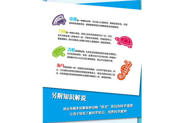 2.书中介绍了豪猪、乌龟、犀牛、大象、北极熊等18种动物的“穿衣”风格,并在书后专门设立知识解说,让孩子轻松了解动物“穿衣”讲究中蕴含的科学道理,培养孩子对自然科学的兴趣。