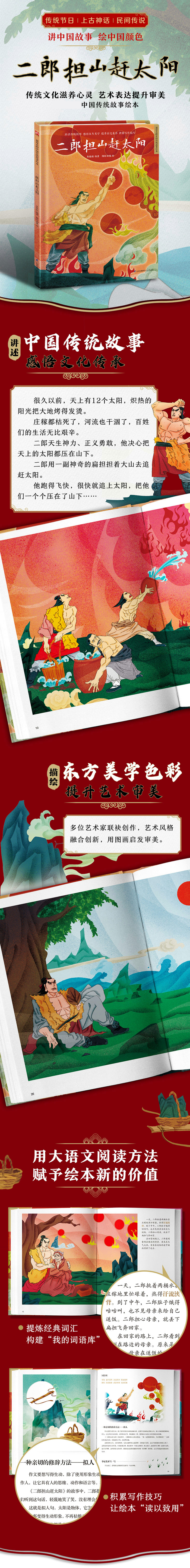 很久以前,天上有十二个太阳,炽热的阳光把大地烤得发烫。庄稼都枯死了,河流也干涸了,百姓们的生活无比艰辛。二郎天生神力、正义勇敢,他决心把天上的太阳都压在山下。二郎用一副神奇的扁担担着大山去追赶太阳。他跑得飞快,很快就追上太阳,把它们一个个压在了山下……