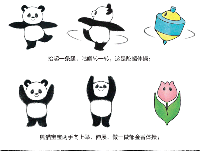 看一看,熊猫做了什么动作?猜一猜,熊猫摆出了什么造型?动一动,快来做熊猫体操吧!