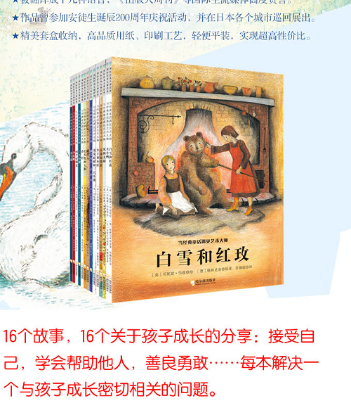 本书是统一定价、销售的图书,包括《冰雪女王》《长头发的大象》《白雪和红玫》《丑小鸭》《稻草人》《风和太阳》《富翁和鞋匠》《公主和木匠》《画眉嘴国王》《冷杉》《金发姑娘和三只小熊》《三只小猪》《睡美人》《四个好朋友》《小红帽》《小雪花》16个分册,内容取材是安徒生童话、格林童话、伊索寓言等经典故事,配以国际绘本大师贝妮黛·华兹手绘图,是适合孩子阅读的优质童话绘本。本册讲述有一位寡妇有两个女儿,一个叫白雪,一个叫红玫,与一个被施了魔法的黑熊的故事,最后大黑熊变成了一位王子。后来,白雪嫁给了王子,红玫嫁给了王子的弟弟,他们都过上了幸福的生活。