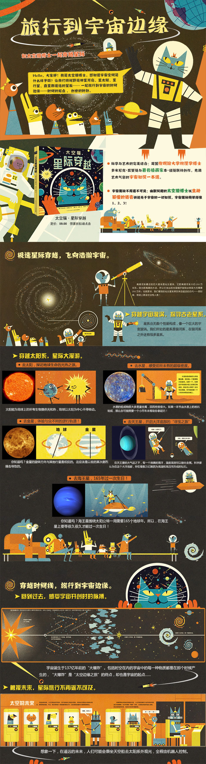 首先,这是一本真正站在读者的角度,千方百计考虑读者的阅读感受的好书。不同于其他宇宙科普书,生硬地将知识灌输给读者,《星际穿越》以太空猫博士为主角,穿插其他一些可爱的动物角色,一起带领读者进行一次宇宙之旅,在旅程中,潜移默化地接受知识,增加了图书的可读性与趣味性。
