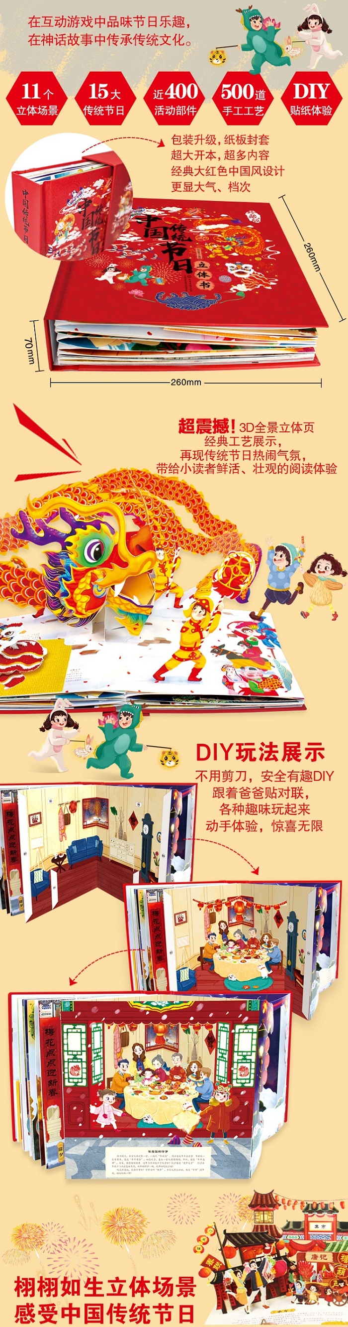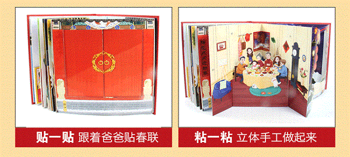 特殊工艺:精湛的3D立体工艺,DIY贴纸体验,精心设计超大立体全景页展示,拉拽机关、转盘、立体小翻页,趣味性互动性超强,提高宝宝的动手能力,让孩子亲身体验过节的无限乐趣。
