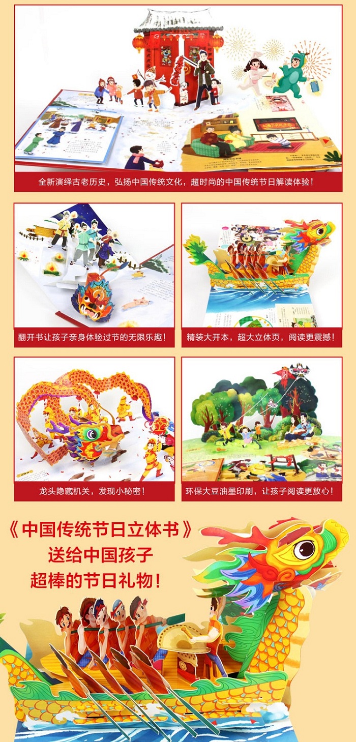 《中国传统节日》立体书完全从孩子的视角进行编写、设计,做成有生动绘图有趣文字的立体玩具书。