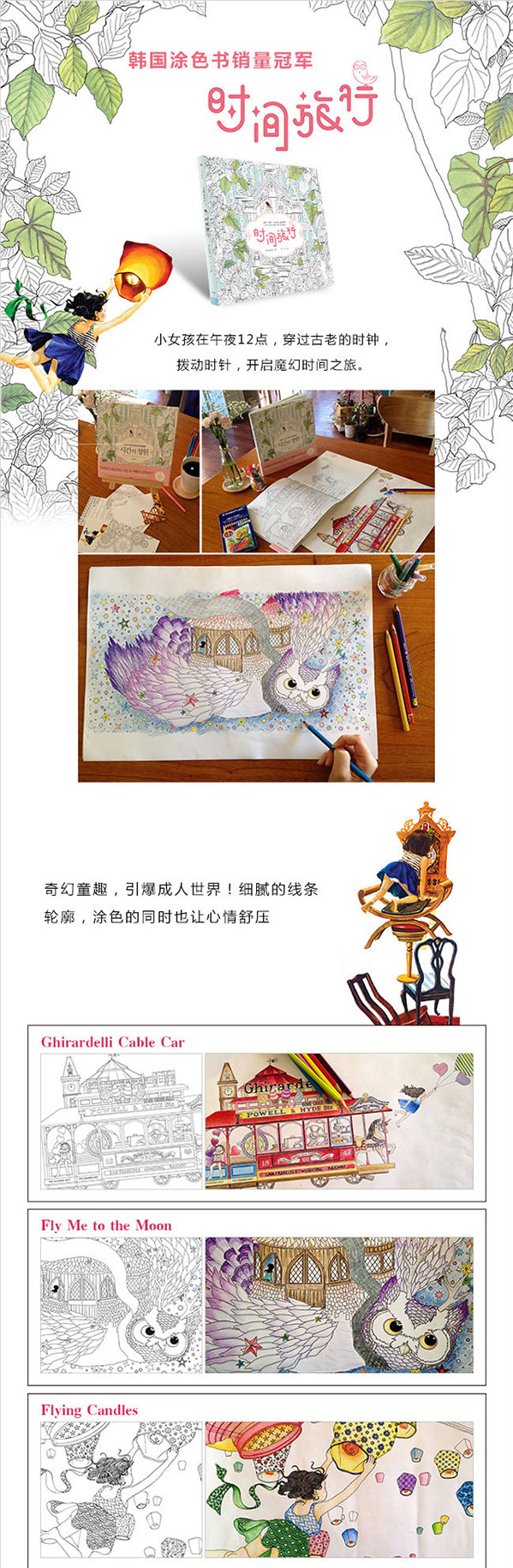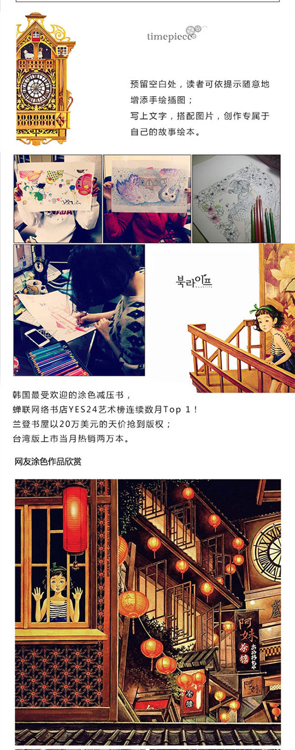1. 《时间旅行》是韩国销量**的涂色减压书:蝉联网络书店YES24艺术榜连续数月Top 1!创下海外授权**纪录:兰登书屋以20万美元的天价抢到版权;台湾版上市当月热销两万本。