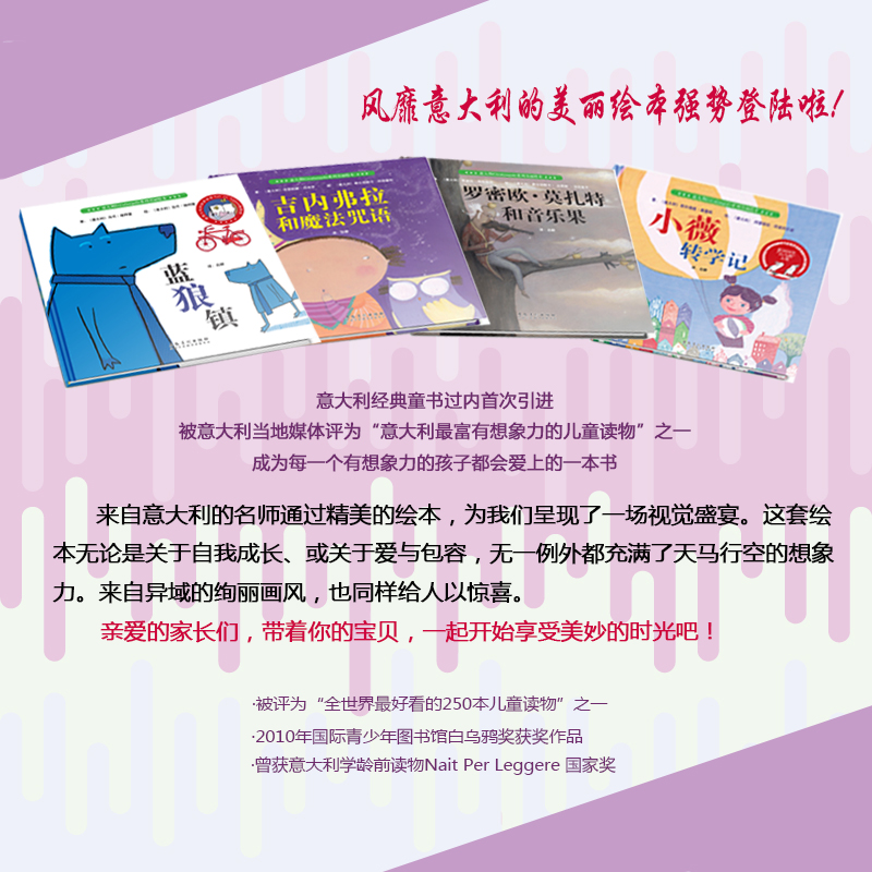 本书荣获2010德国国际青少年图书馆“白乌鸦”奖,入选“全世界*好看的250本儿童读物”。意大利官方大力推荐的儿童指定读物,持续五年畅销,风靡意大利,帮助孩子适应新环境,为孩子们献上爱与色彩的童话。