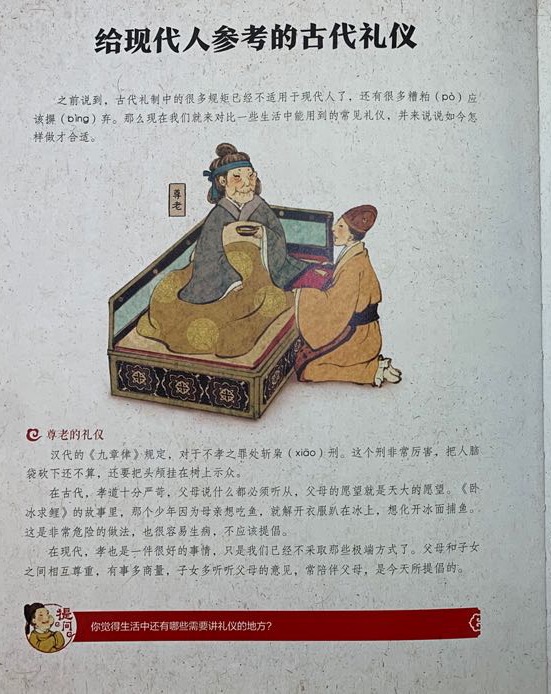 (二) 知识系统。从礼制起源,到重点的成人礼、婚礼、丧礼均有介绍,更涉及古今对照,让孩子了解现代礼仪,同时具有批判眼光。