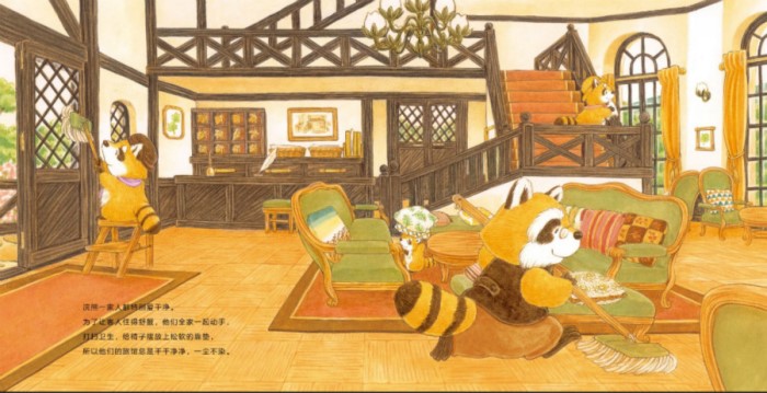 故事展现了浣熊一家为每一位动物客人找到符合他们体型和特点的房间,这样的贴心与智慧,相信小读者们一定也能意会。故事中来投宿的客人有蛇、大熊、猫头鹰与一群小鸟。浣熊一家人为他们安排了适合他们特点的客房。比如:蛇住进了横树枝客房,睡在五张床拼起来的大床上,满足了蛇想要神展开腰身休息的愿望。大块头的熊住进粗树干客房,房间里的桌椅尺寸都很适合熊的身材。*后一组客人是二十只旅行中的小鸟,可是旅馆里没有那么多张床。小鸟们要怎么休息呢? 这时小浣熊毛利想出了好主意,把旅馆里的靠垫拿来当床。小孩子也能想出好主意,这样的内容很鼓舞小读者。除此之外,浣熊爸爸不仅厨艺很棒,还为客人制作了造型独特的甜点,这些好吃的不仅让孩子感受到生活的美好,更能丰富他们的想象力、启发他们去创造美好生活。
