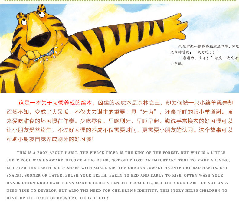凶猛的老虎本是森林之王,却为何被聪明的绵羊拔光了牙,还满口道谢呢?原来是爱吃甜食的坏习惯在作祟。少吃零食、早晚刷牙、早睡早起、勤洗手常换衣……良好的习惯可以让孩子受益终生。好习惯的养成需要时间,需要孩子的认同,需要持之以恒。