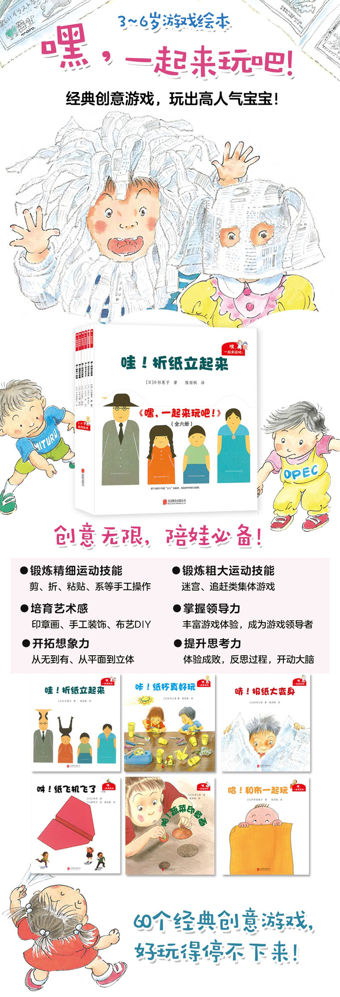 这套创意游戏绘本针对3-6岁学龄前儿童,由浅入深,循序渐进,囊括了立体折纸、剪纸、印章画、纸杯、叠布、纸飞机六大经典游戏。多达60个趣味创意游戏,将经典玩出新花样。将艺术与游戏合二为一,鼓励孩子手脑并用,玩出思考力和创造力!
